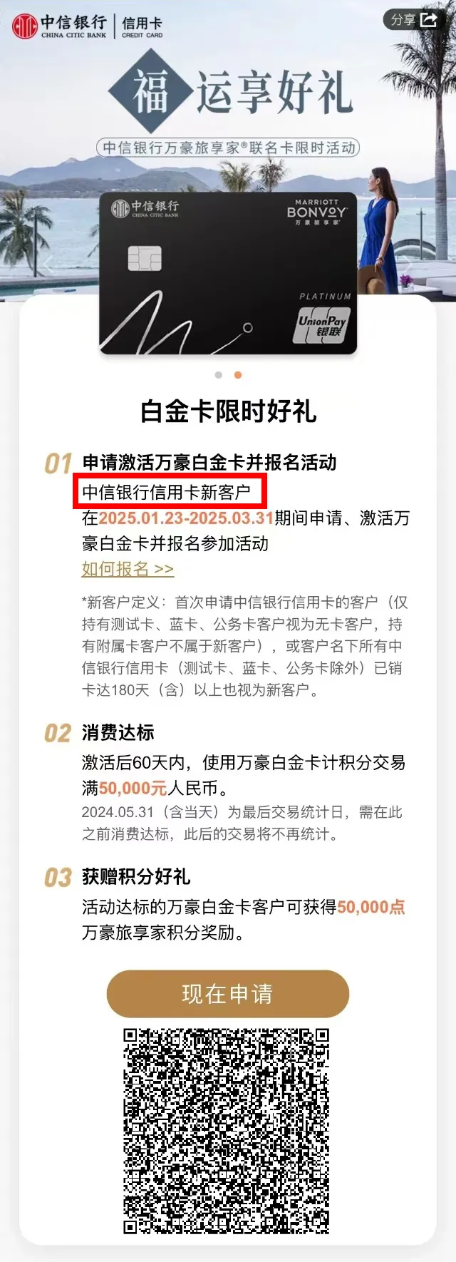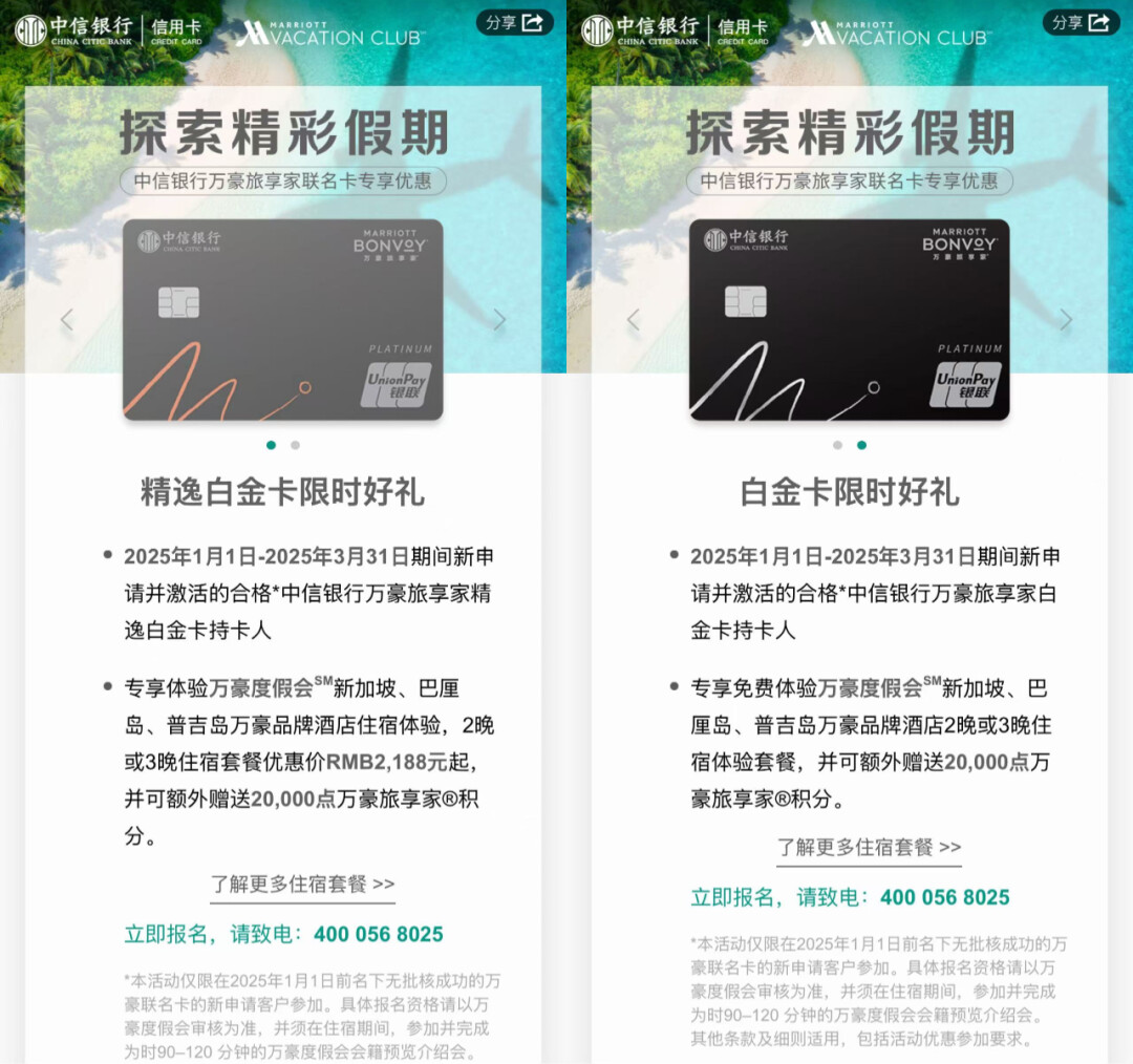 不过仅限中信银行信用卡新客户,且仅限万豪精逸白金卡、万豪白金卡有限时好礼: