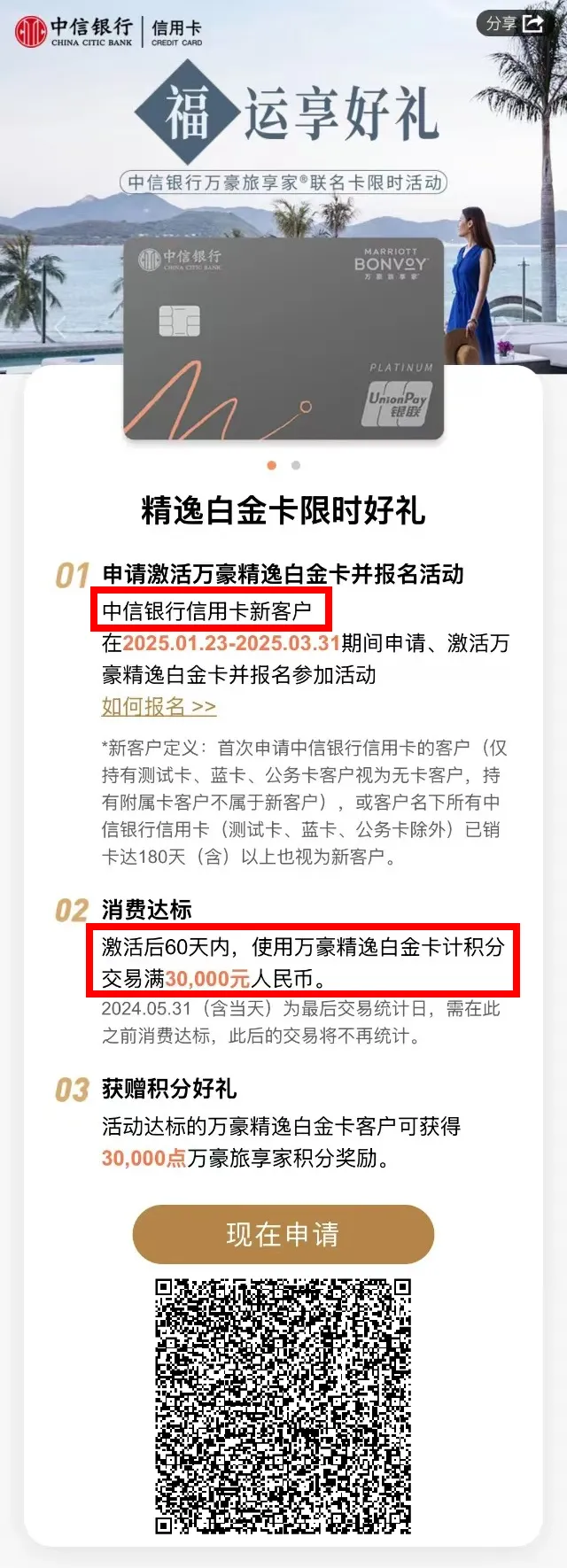 中信新客户申请万豪精逸白金卡,激活后60天内计积分消费满3万元,赠送3W万豪积分。