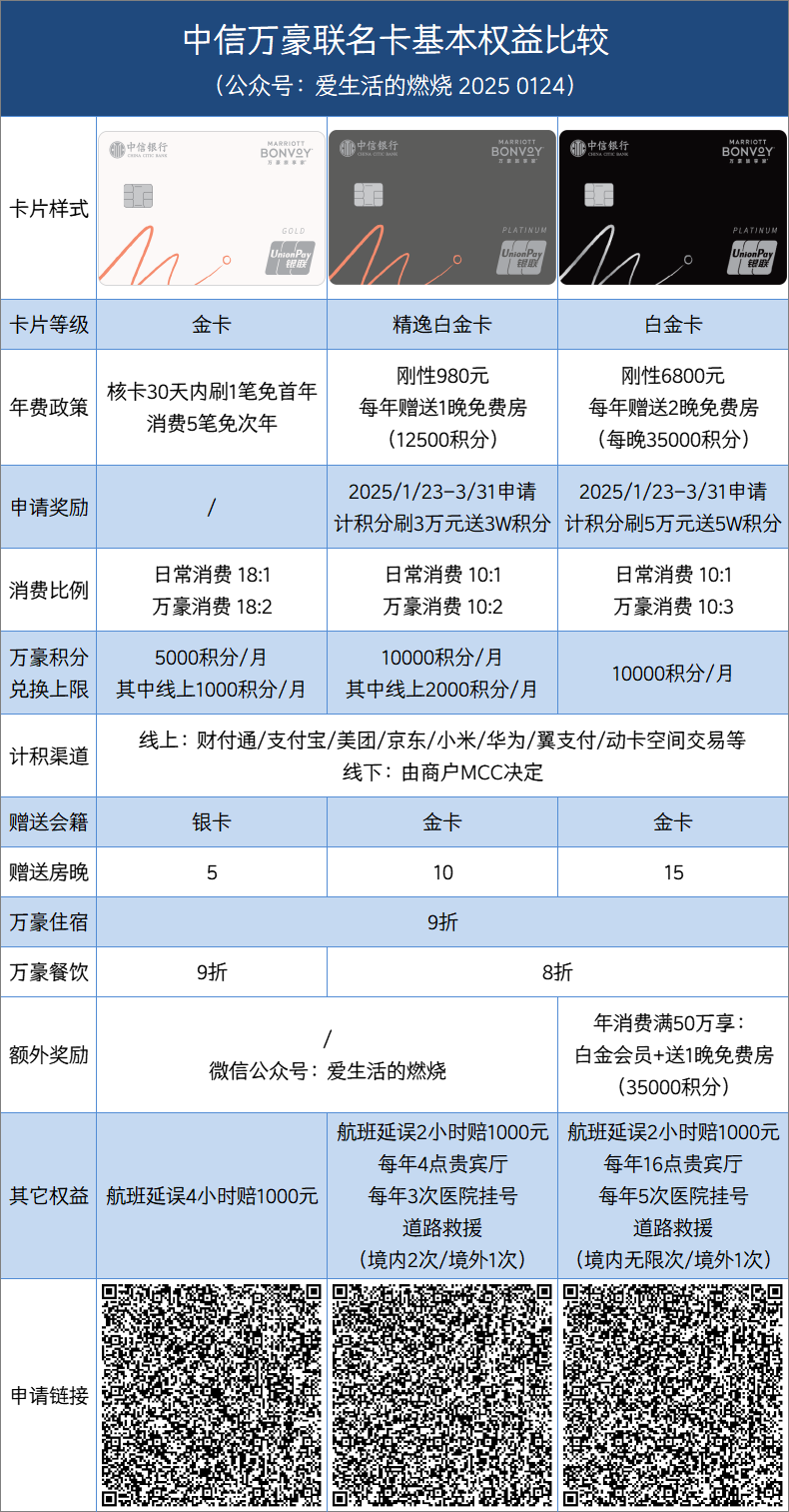 此外,万豪精逸白金卡年费980元,权益包括每年1晚12500积分的免费房和每年10个房晚。万豪白金卡年费6800元,权益更丰富。中信万豪联名卡线下消费计积分的MCC范围有所调整,仅限特定20个MCC。